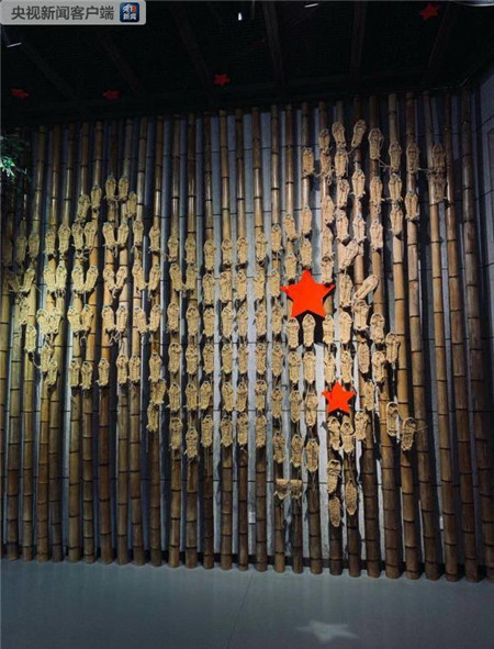 △中央紅軍長征出發(fā)紀念館展出的“草鞋地圖”。這是紅軍長征勝利80周年時,用紅五星和80雙草鞋繪出的中國地圖。(央視記者邢彬拍攝)