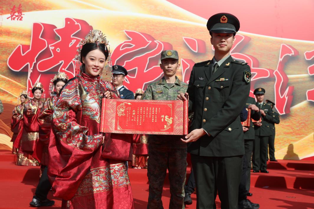 上午10時(shí),鑼鼓震天、吉獅歡舞,80對(duì)新人手挽手,緩緩踏上紅毯?;槎Y儀式正式開啟,“卻扇納祥”環(huán)節(jié)中新娘將團(tuán)扇交予新郎,象征攜手開啟新生活;“禮拜天地”環(huán)節(jié)中,一拜感恩祖國(guó)護(hù)佑山河無恙,二拜感恩父母養(yǎng)育與部隊(duì)培養(yǎng),三拜感恩彼此相許守諾言;緊接著“喜印婚書”,彰顯新人們“執(zhí)子之手,與子偕老”的決心;再行“合巹成喜”,寓意未來甘苦與共;最后“執(zhí)手盟誓”,以莊重承諾定格幸福時(shí)刻。