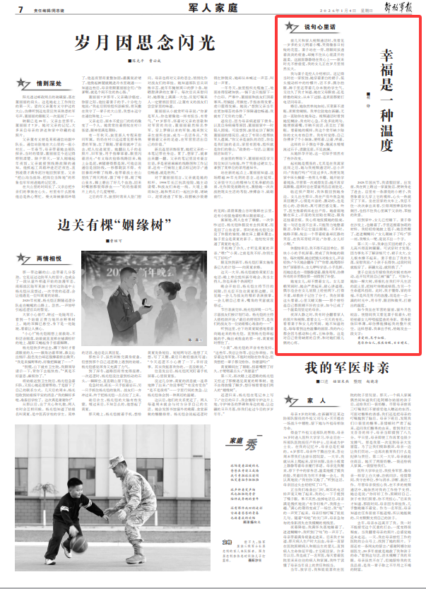 如今我坐在軍營(yíng)的窗前,窗外月色皎潔。恍惚間我又看見(jiàn)妻子低著頭,輕輕拍著女兒哼唱搖籃曲的身影。那身影依舊單薄,卻仿佛能撐起我的整片夜空。這樣想著,我拿出手機(jī),給她發(fā)去一段文字: