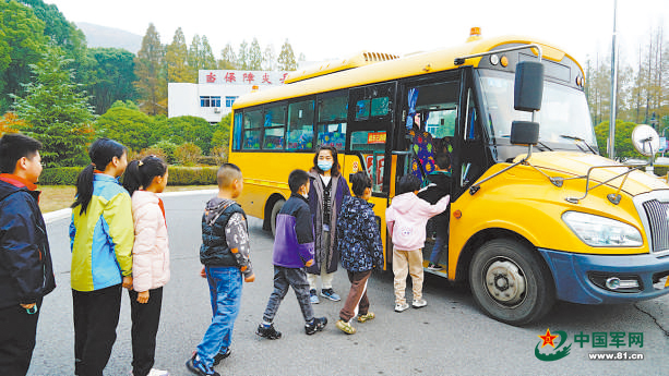 某部官兵子女有序登上校車。