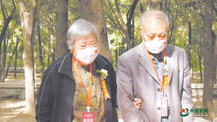 李慶英(左)在丈夫岳增和陪同下肅立在父親墓前。