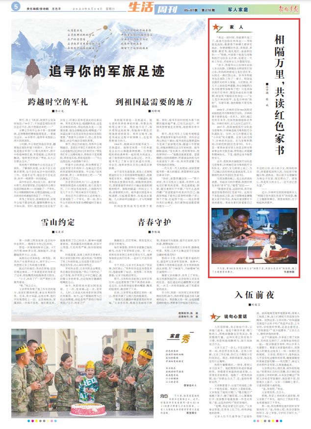 “敬愛的老爸,這段時(shí)間,我開始重讀您推薦的《紅色家書》。這些寫于奔赴戰(zhàn)場(chǎng)之前、戰(zhàn)斗間隙或是慷慨就義前夕的書信,我每次重讀都有不同的感悟。革命先輩們深愛著自己年邁的父母、幼小的子女、相知的伴侶,深愛著祖國(guó)和人民,為信仰不惜拋頭顱、灑熱血。我以前不太理解你為啥總不在家,現(xiàn)在明白了。請(qǐng)放心,我是軍人的女兒,一定不會(huì)讓您失望。”