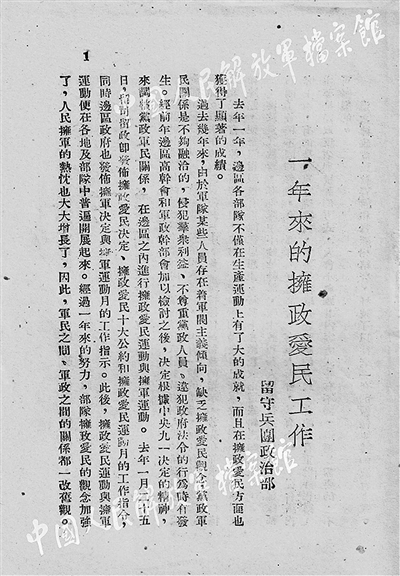 人民軍隊(duì)來自人民,服務(wù)于人民,自誕生之日起,便將“擁政愛民”融入血脈。1944年3月,八路軍留守兵團(tuán)政治部編印的《一年來的擁政愛民工作》,如今珍藏在解放軍檔案館。這份文件用近2萬字對(duì)部隊(duì)擁政愛民工作進(jìn)行細(xì)致分析,讓我們看到了當(dāng)年部隊(duì)對(duì)群眾工作的高度重視和其背后的良苦用心。