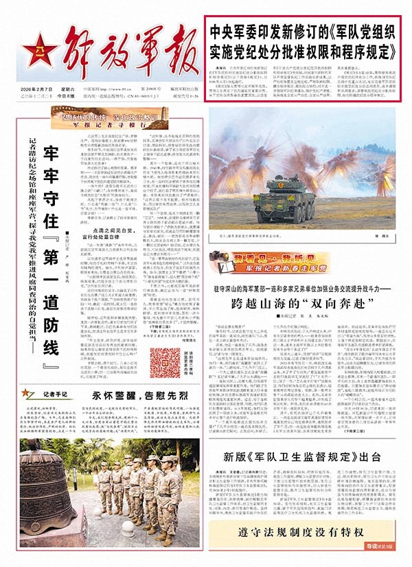 解放軍報(bào)訊 中央軍委近日印發(fā)新修訂的《軍隊(duì)黨組織實(shí)施黨紀(jì)處分批準(zhǔn)權(quán)限和程序規(guī)定》(以下簡稱《規(guī)定》),自2026年3月1日起施行。