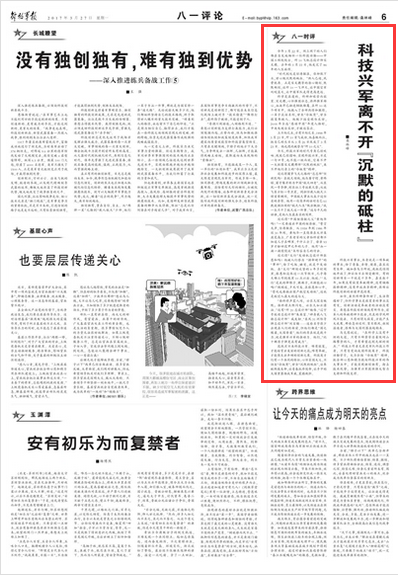 “誰終將聲震人間,必長久深自緘默;誰終將點燃閃電,必長久如云漂泊。”還有“殲20總設(shè)計師”楊偉、“遼寧號航母總設(shè)計師”朱英富、“神舟載人飛船總設(shè)計師”戚發(fā)軔、“東風(fēng)31洲際導(dǎo)彈總設(shè)計師”劉寶鏞……這些名字很少出現(xiàn)在人們的面前,但他們都是“國之棟梁,大國脊梁”。他們的存在就是戰(zhàn)斗力,就是強軍興軍的推動力。他們,“比十顆原子彈更具有威力”。