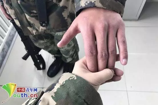 迎著風(fēng)雪來到十七中隊的二號哨位,記者看到,戰(zhàn)士張春健正在一邊吸著氧氣一邊站崗執(zhí)勤。長期在高原訓(xùn)練生活,張春健的臉上烙下了明顯的“高原紅”,而雙手因紫外線照射與嚴寒,黝黑且?guī)е椓选ky以想象,這是一雙出生于1998年的戰(zhàn)士的手。