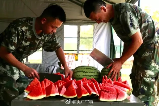 媒體曝光了正在抗洪一線奮戰(zhàn)官兵的伙食,從照片中可以看出,有葷素搭配的熱食,還有解暑的西瓜。