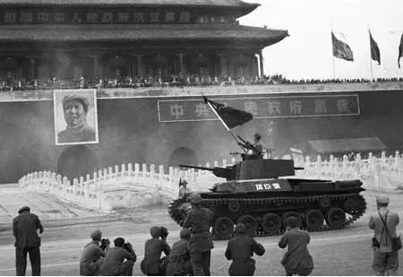 開國大典受閱坦克方隊(duì)的領(lǐng)隊(duì)車長董來扶駕駛著“功臣號(hào)”通過天安門廣場(chǎng)。圖片來源:解放軍畫報(bào)