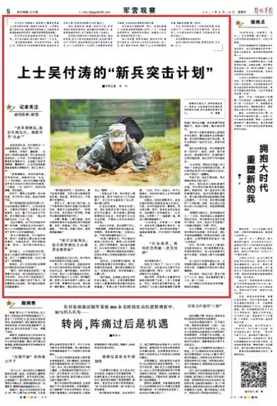吳付濤正在經(jīng)歷自己軍旅的重大轉(zhuǎn)折。相近的時(shí)刻,在大江南北的座座軍營(yíng)里,在這場(chǎng)“脖子以下”改革中,相似的轉(zhuǎn)崗也在很多官兵身上發(fā)生:從一個(gè)兵種到另一個(gè)兵種,從保障崗位到戰(zhàn)斗班排,從傳統(tǒng)戰(zhàn)位到新型作戰(zhàn)力量……