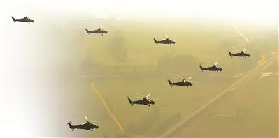 “起飛!”指令下達(dá)后,伴著發(fā)動機(jī)隆隆的轟鳴聲,數(shù)十架武裝直升機(jī)朝著日出的方向漸次騰空而起、掠云翱翔……