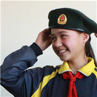 小學(xué)生佩戴貝雷帽體驗(yàn)敬禮。
