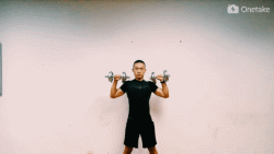 2.向上推舉啞鈴高過頭部,注意肘關(guān)節(jié)不要鎖死,靜止,緩慢下放,重復(fù);