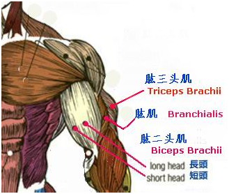 肱二頭肌是上肢上最大的一塊肌肉并且構(gòu)成了上臂上部的外形。它有兩個部分,一個長頭,一個短頭,它們都跨過肘關(guān)節(jié)和肩關(guān)節(jié)。肱三頭肌在上臂后面延伸,可伸直或伸展該臂,它有三個頭:一個附著在肩胛骨上(中間的長頭),另兩個(內(nèi)側(cè)頭、外側(cè)頭)附著在肱骨上。肌肉的遠端有一條有力的腱在肘處附著在尺骨上。肱二頭肌主要功能是拉,而肱三頭肌的主要功能是推。肱三頭肌和肱二頭肌相對,前者的作用是伸臂,任何抵抗一定阻力的伸臂動作都將會刺激這部分肌肉,所以,有許許多多的肱三頭肌練習(xí)方法。而后者的作用是屈臂。