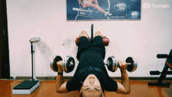 1.雙手持啞鈴,仰臥平躺于健身凳上,將啞鈴放在胸部兩側(cè),肘部向外,旋轉(zhuǎn)手腕使大拇指相對;