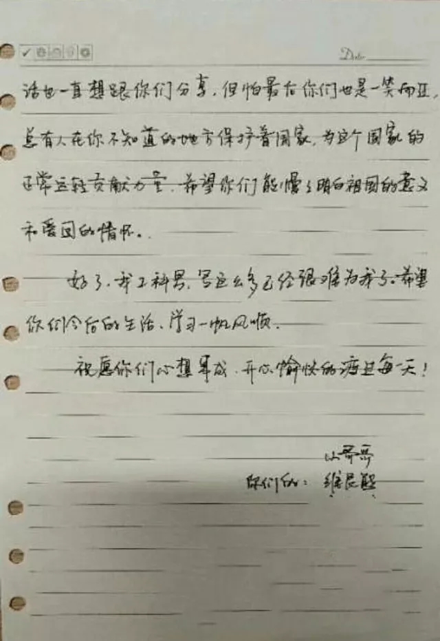 注:2017年的大一新生軍訓(xùn)活動結(jié)束后,華中科技大學(xué)學(xué)生會公眾號推送的文章《想到你時,我會忘記明天就要說再見》,對軍訓(xùn)活動作了總結(jié),其中配發(fā)了這封信的圖片。