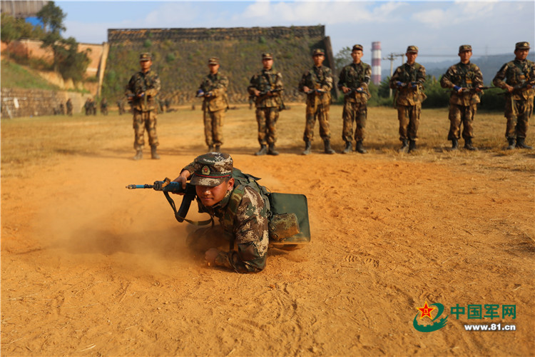 “臥倒,前方十米處--低姿匍匐--前進(jìn)!”隨著指揮員一聲令下,戰(zhàn)士們迅速臥倒,收腿、伸臂、出槍,新戰(zhàn)士在枯黃的草地上不斷交替,練習(xí)匍匐前進(jìn),撲騰的手腳揚(yáng)起一片沙塵。