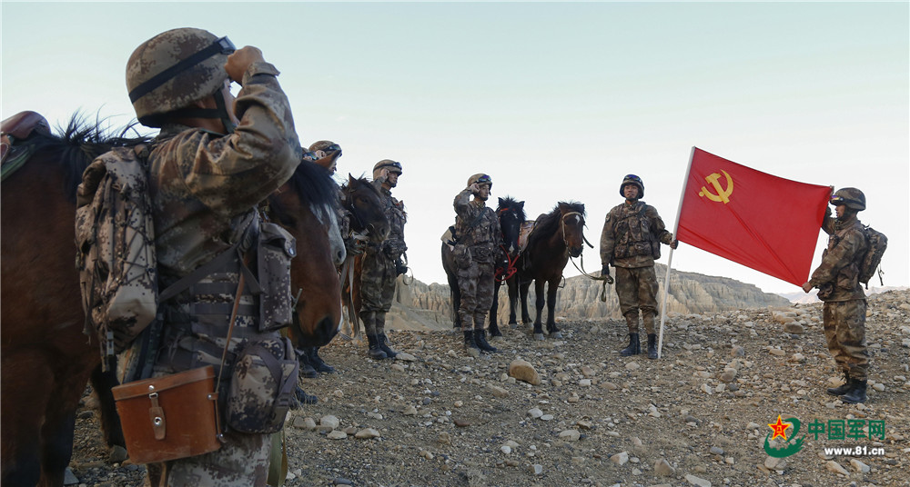 即將退伍的老兵黨員最后一次在邊防線上面向黨旗莊嚴(yán)宣誓。(劉曉東攝)