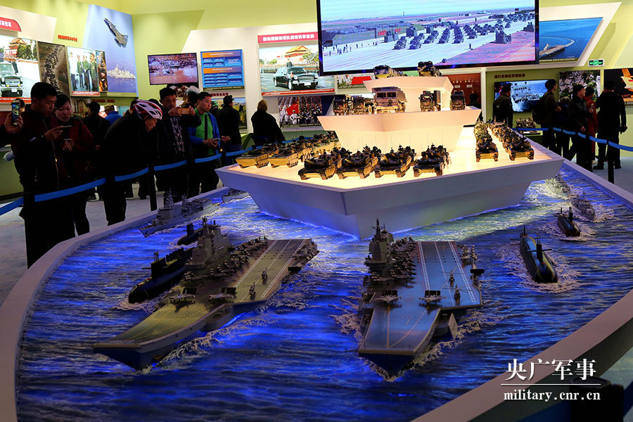 走進(jìn)國(guó)防和軍隊(duì)建設(shè)展廳,首先映入眼簾的是改革強(qiáng)軍主題模型展臺(tái)。展臺(tái)外形像一艘巨輪,寓意在黨的絕對(duì)領(lǐng)導(dǎo)下,人民軍隊(duì)向著強(qiáng)軍目標(biāo)劈波斬浪揚(yáng)帆遠(yuǎn)航。展臺(tái)上,122個(gè)型號(hào)的海軍、陸軍、空軍、火箭軍各類武器裝備模型,展示了40年來(lái)我軍主戰(zhàn)裝備創(chuàng)新發(fā)展的突出成果。