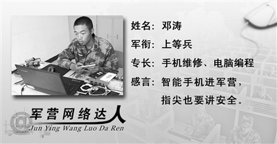 鄧濤對(duì)智能手機(jī)可謂“一往情深”,入伍前他就是個(gè)“拇指族”。因?yàn)榧依镩_著手機(jī)維修店,他平常總喜歡嘗試著把壞了的手機(jī)拆開搗鼓。時(shí)間長了,慢慢掌握了許多手機(jī)維修的小竅門,對(duì)手機(jī)的構(gòu)造、零部件也爛熟于心。后來,鄧濤考上了電子通訊專業(yè),經(jīng)過幾年的專業(yè)學(xué)習(xí)后,成了名副其實(shí)的“手機(jī)大拿”。