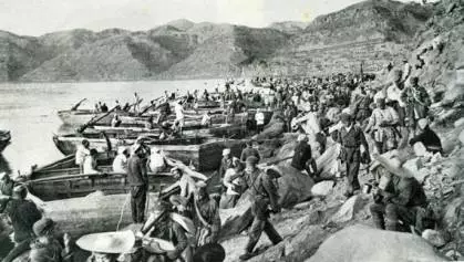 八路軍總指揮朱德(右一)、政治部主任任弼時(右二)、副參謀長左權(quán)(右三)等在渡船上。