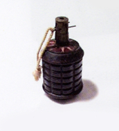 日軍九七式手榴彈 作為一種重要的單兵近戰(zhàn)武器,在侵華日軍武器彈藥中,手榴彈就有9種,包括:布尾式手榴彈、擦火式手榴彈、九一式手榴彈、九七式手榴彈、九八式手榴彈、九九式手榴彈、木柄式手榴彈、短柄手榴彈、手投燃燒彈等。其中九七式手榴彈是日本在侵華戰(zhàn)爭中使用最多、最廣泛、知名度最高的一種手榴彈,代表了當(dāng)時日本手榴彈的最高發(fā)展水平。由于九七式手榴彈形狀很像中國北方的香瓜,被中國軍隊?wèi)蚍Q為“香瓜手雷”。