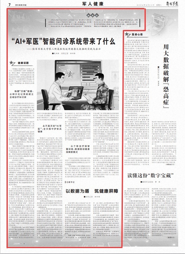 邊關哨所,戰(zhàn)士小張通過“AI+軍醫(yī)”智能問診系統(tǒng)得到精準診療;雪域高原,便攜式超聲為腹痛戰(zhàn)士揪出隱匿出血點……這一幕幕場景,讓記者深刻感受到:健康大數(shù)據,正從塵封的檔案柜走向練兵備戰(zhàn)的前沿。
