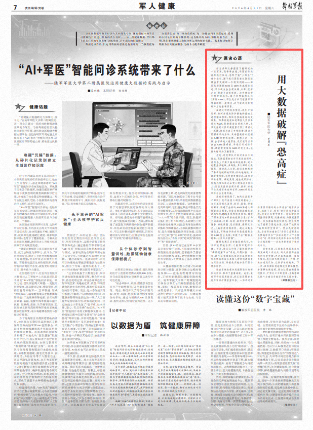 回望來路,從聚焦急性高原反應高發(fā)難題立項攻關,到大數(shù)據篩查技術的研發(fā)突破,再到成果落地一線服務官兵,我們其實就是做了一件事:把未知變成已知,讓防護有的放矢。下一步,我們團隊將繼續(xù)優(yōu)化算法模型、豐富樣本數(shù)據庫,努力讓篩查精度持續(xù)提升、干預關口不斷前移,為高原部隊戰(zhàn)斗力建設貢獻堅實的衛(wèi)勤力量。