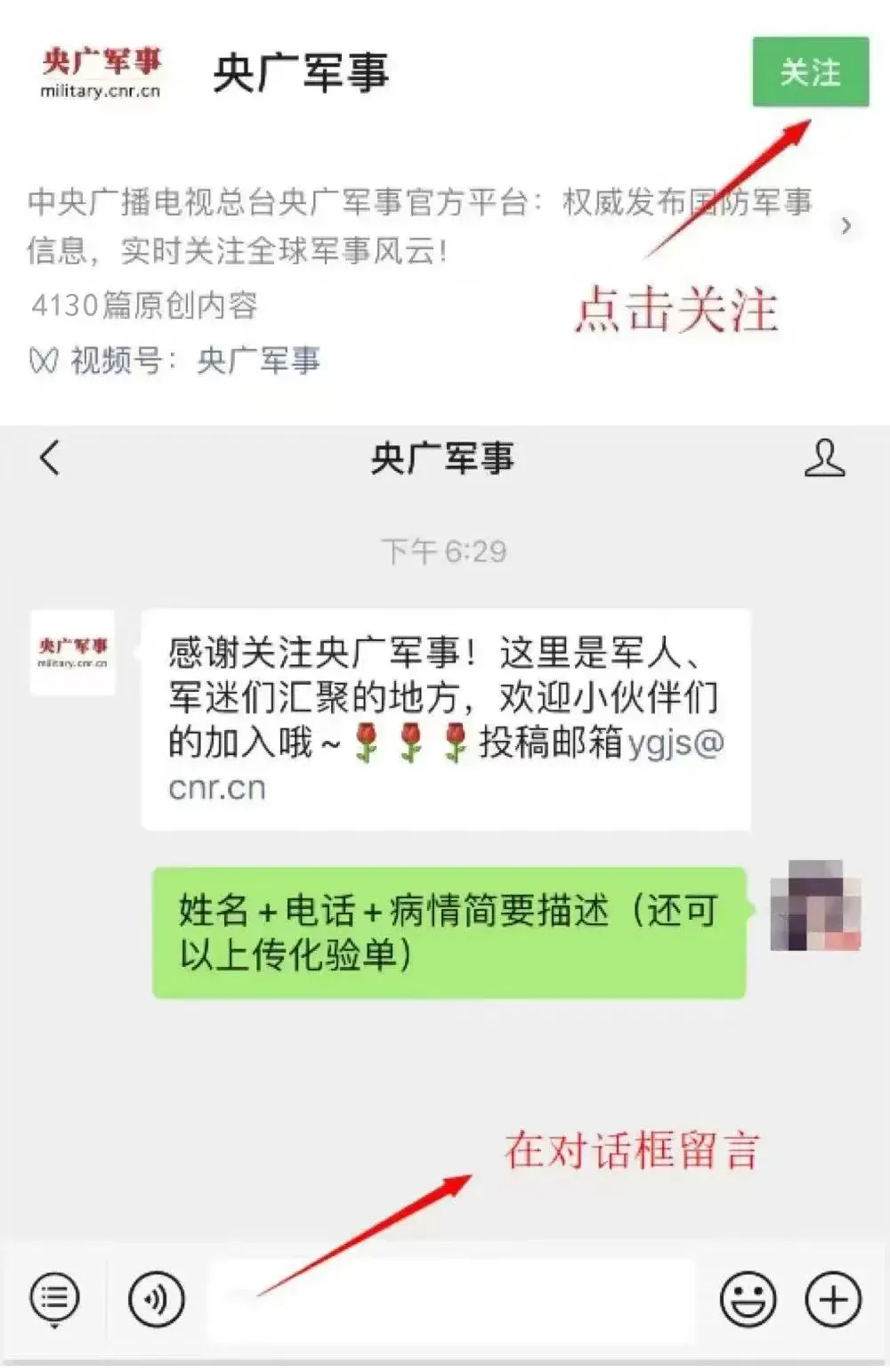 (1)即日起,關(guān)注“央廣軍事”微信公眾號,在后臺回復(fù)關(guān)鍵詞“軍醫(yī)來了”,或直接留言您的“姓名+電話+病情簡要描述(還可以上傳化驗單)”,我們將邀請專家在直播當(dāng)天進行答疑。