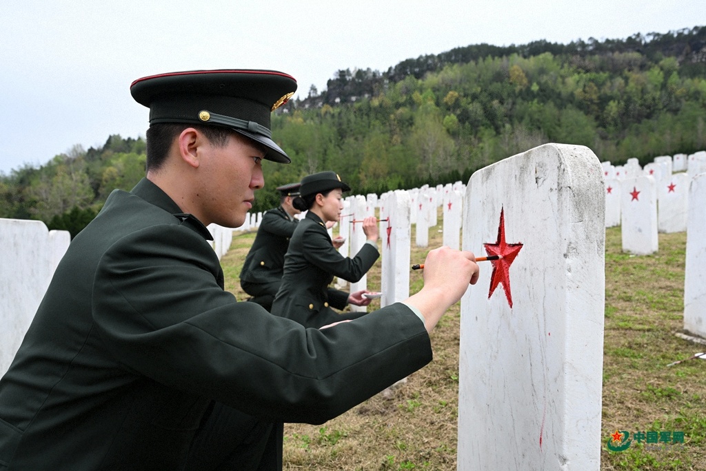 官兵為紅軍烈士墓碑描紅。李柳靜 攝
