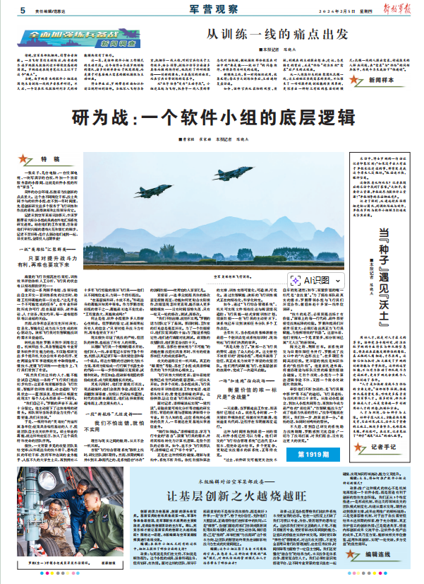 政委:推廣這種模式的核心不是機(jī)械地再組建一個(gè)軟件小組,而是營(yíng)造有利于創(chuàng)新的整體生態(tài)環(huán)境。我們正從3個(gè)維度推進(jìn):一是形成機(jī)制,將這類跨領(lǐng)域攻關(guān)的團(tuán)隊(duì)模式制度化,構(gòu)建從需求發(fā)現(xiàn)、項(xiàng)目啟動(dòng)到資源支撐、成果應(yīng)用推廣的順暢鏈路;二是完善容錯(cuò)機(jī)制,對(duì)于出于備戰(zhàn)需要但結(jié)果未達(dá)預(yù)期的探索,給予充分理解,真正保護(hù)官兵的創(chuàng)新熱情;三是促進(jìn)共享,搭建內(nèi)部創(chuàng)新成果交流平臺(tái),讓軟件小組產(chǎn)出的成果、工具乃至方案,能夠被相關(guān)單位借鑒、運(yùn)用和再創(chuàng)新,實(shí)現(xiàn)“一處突破、多方受益”的良性循環(huán)。