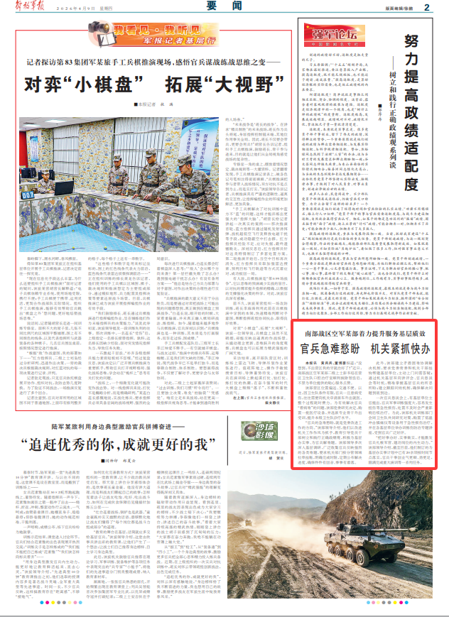 “官兵的急難愁盼,就是黨委改進工作的方向?!痹摬款I導介紹,他們以改進機關工作作風為抓手,教育引導黨員干部樹立和踐行正確政績觀,積極為基層辦實事、為官兵解難題。該部領導多次深入基層調(diào)研,廣泛收集官兵反映強烈的各類難題,要求機關部門按分管領域拉單掛賬,明確完成時限,定期公布解決進度,確保件件有回音、事事有著落。