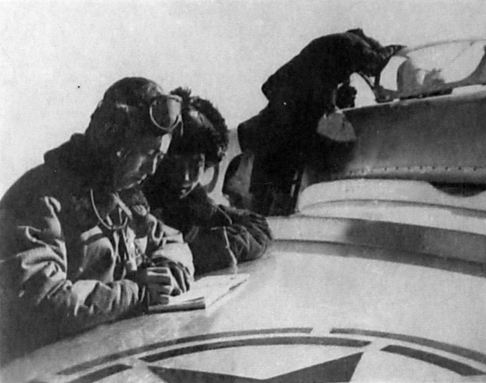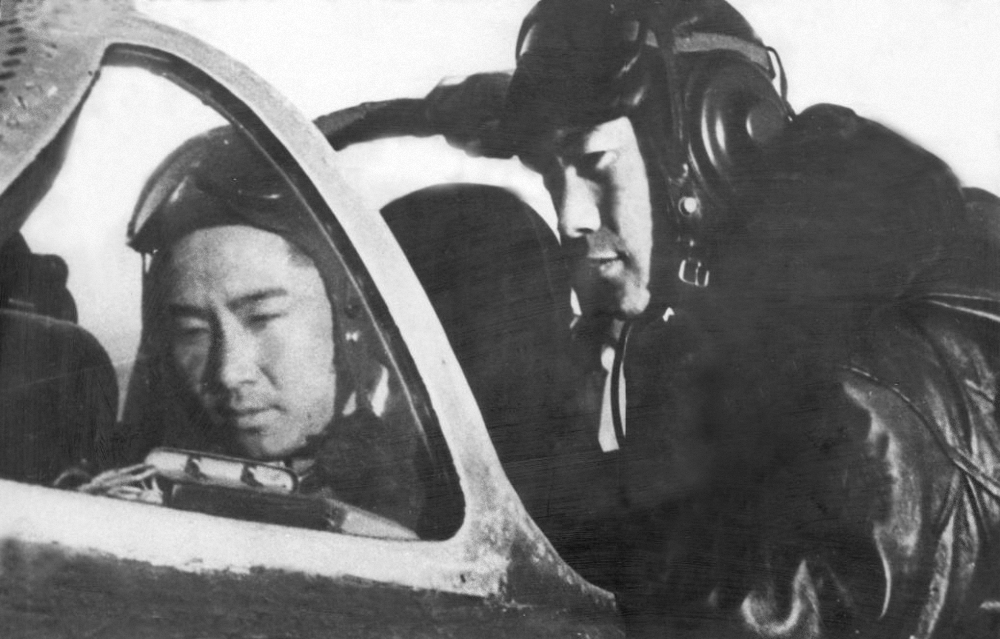 ↑志愿軍航空兵某團(tuán)兩名飛行員一同研究裝備。(資料照片)
