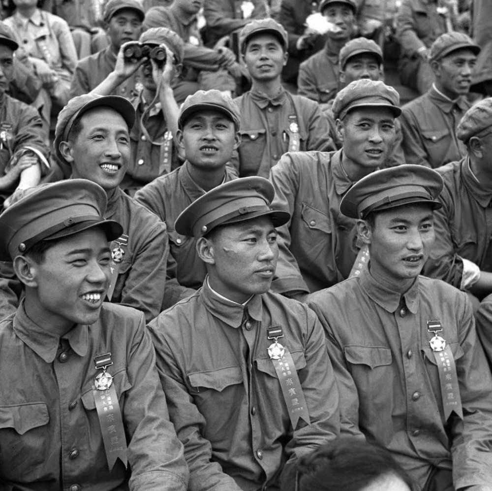 ↑這是1952年8月1日在“八一”體育運(yùn)動(dòng)大會(huì)看臺(tái)上的中國(guó)人民志愿軍代表團(tuán),前排左一為趙寶桐。(袁苓 攝)