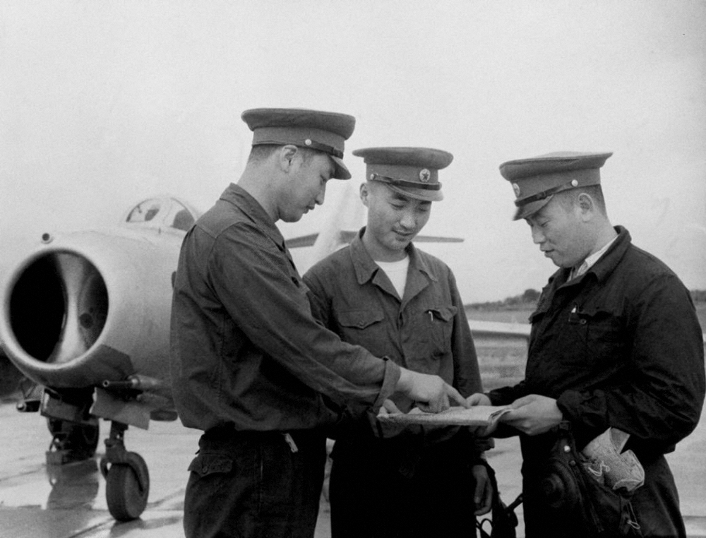 ↑1957年7月25日中國(guó)人民解放軍空軍劉玉堤少校(左一) 在飛行前與戰(zhàn)友們正在研究航線。(新華社發(fā))