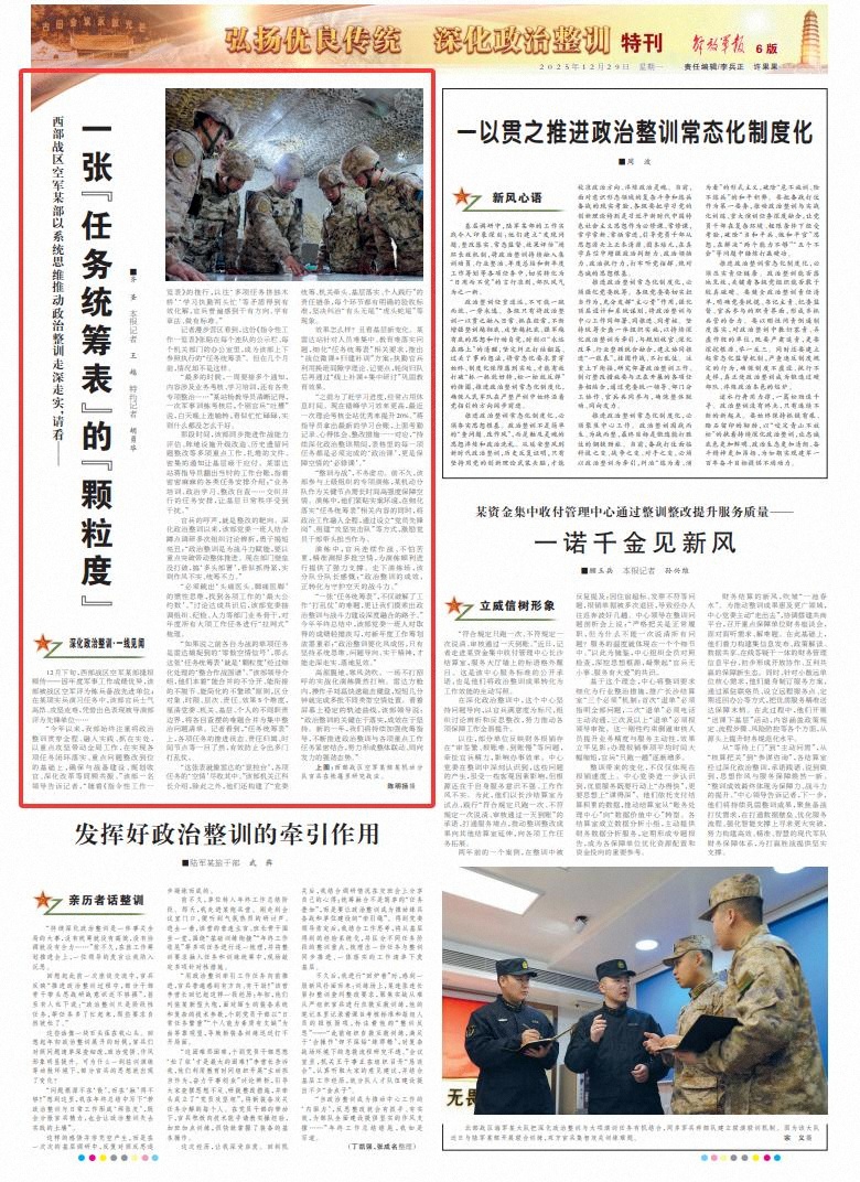 “一張‘任務(wù)統(tǒng)籌表’,不僅破解了工作‘打亂仗’的難題,更讓我們摸索出政治整訓與戰(zhàn)斗力建設(shè)深度融合的路子?!苯衲昴杲K總結(jié)中,該部黨委一班人對取得的成績輕描淡寫,對新年度工作籌劃濃墨重彩:“政治整訓要化風成俗,只有堅持系統(tǒng)思維、問題導向、實干精神,才能走深走實、落地見效?!?/p>