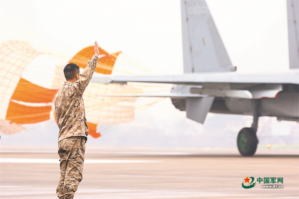 戰(zhàn)機(jī)返航,保傘員示意飛行員拋傘。