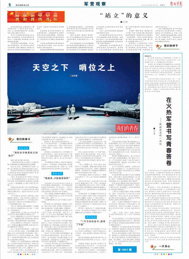 如今,我越來(lái)越覺(jué)得,自己不僅是戰(zhàn)士們的兄長(zhǎng),更是警衛(wèi)連的一名新兵。能在這1平方米的哨位上,日復(fù)一日地“站立”,用青春丈量忠誠(chéng)的刻度,本身就是一種了不起的“樣子”。能成為他們中的一員,與他們一同學(xué)習(xí)“站立”,是我軍旅生涯最珍貴的榮光。