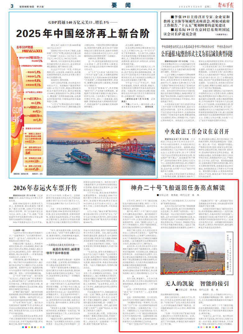 1月19日,神舟二十號飛船返回艙在東風(fēng)著陸場成功著陸,神舟二十號飛船返回任務(wù)取得圓滿成功。此次任務(wù)有何新亮點(diǎn)、新突破?