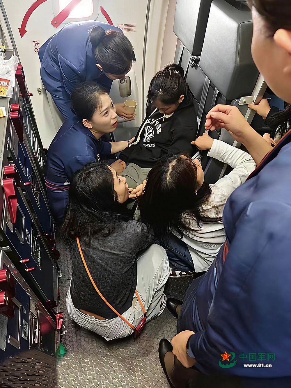 2月24日上午,徐艷麗(左下者)在機(jī)艙內(nèi)為暈厥女孩進(jìn)行診斷。受訪者供圖