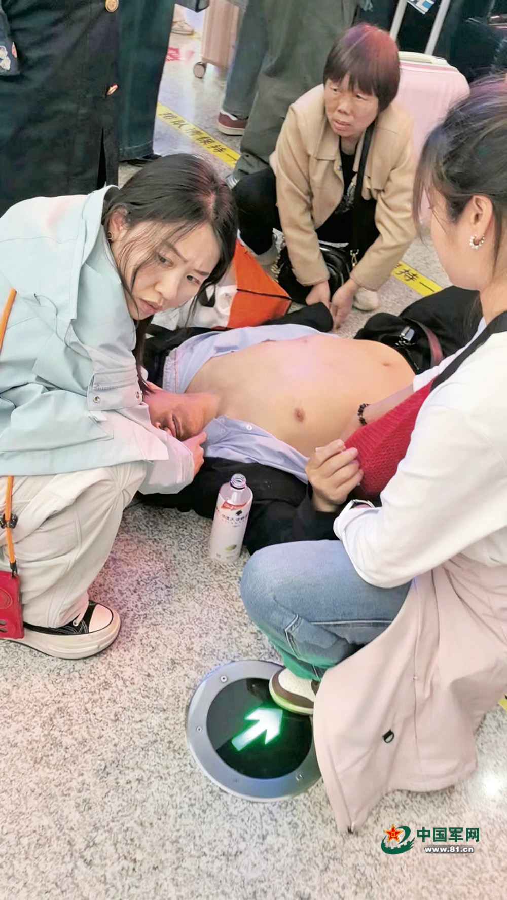 2月24日傍晚,徐艷麗(左一)在高鐵站為倒地男子進(jìn)行急救。鐘潔 攝
