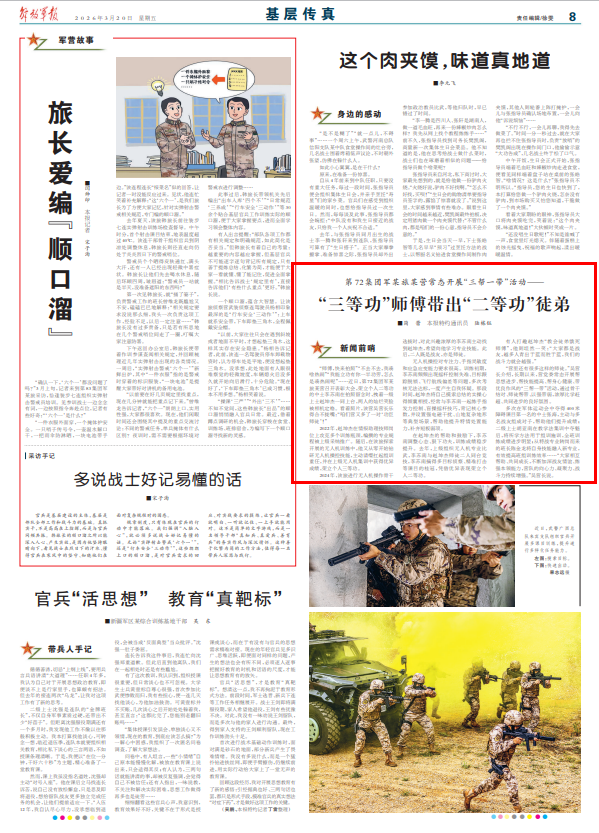 “師傅,快來拍照”“不去不去,我湊啥熱鬧”“我能立功有你一半功勞,怎么是湊熱鬧呢”……近日,第72集團(tuán)軍某旅某營召開表彰大會(huì),榮立個(gè)人二等功的中士李蘇南在拍照留念時(shí),拽著一級(jí)上士趙坤杰一同上臺(tái),兩人的燦爛笑臉被相機(jī)定格??粗掌摖I吳營長樂得合不攏嘴:“咱們營又多了一對‘功臣師徒’!”