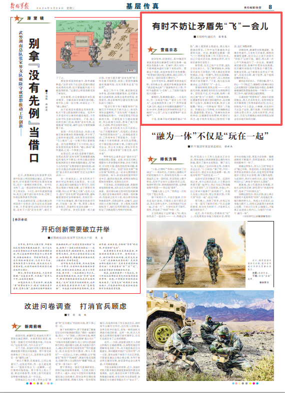 從最初的“兩看相厭”,到如今的情同摯友,兩人關(guān)系的變化,也給鐘指導(dǎo)員開展管理工作帶來新的啟發(fā):官兵之間難免產(chǎn)生小誤會(huì)、小摩擦,對(duì)此有時(shí)不必急于定性、強(qiáng)行說教,不妨把問題交給當(dāng)事人雙方、交給火熱軍營(yíng),并肩戰(zhàn)斗、甘苦與共錘煉出來的深厚戰(zhàn)友情會(huì)告訴他們?nèi)绾位狻?/p>