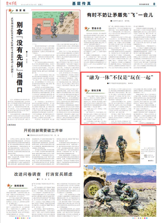 回顧這段經(jīng)歷,我認識到,戰(zhàn)士真正需要的不是簡單的“玩伴”,而是能扛事、能引路的帶頭人。和戰(zhàn)士關系再好,自身能力跟不上,同樣無法贏得大家的真心信服。只有以行立身、以能服人,才能真正走進戰(zhàn)士的內心,與他們“打成一片、融為一體”。