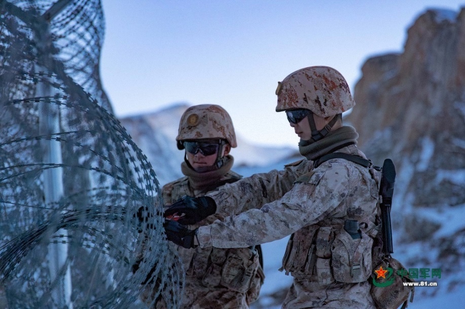 官兵在巡邏途中修繕鐵絲網(wǎng)。馬文清 攝