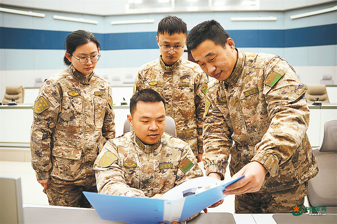 陸軍某訓(xùn)練基地導(dǎo)演部成員探討演訓(xùn)方案。