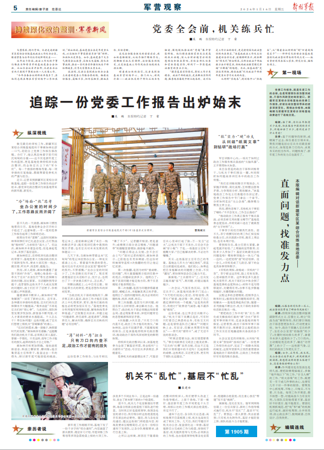 黨委工作報告,既是年度工作的總結(jié),也是觀察部隊政治整訓成效、干部作風轉(zhuǎn)變的鮮活窗口。新疆軍區(qū)某綜合訓練基地的黨委工作報告,折射出政治整訓帶來的諸多深層變化。圍繞這份報告,軍營觀察版編輯與新疆軍區(qū)某綜合訓練基地政委進行了連線交流。