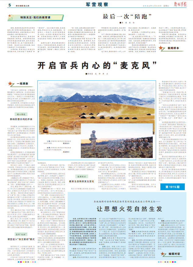 當(dāng)前,全軍部隊(duì)正深入推進(jìn)思想政治教育改革創(chuàng)新。如何增強(qiáng)教育的時(shí)代性、感召力?如何讓教育真正觸及靈魂、賦能打贏?這已成為帶兵人必須回答好的時(shí)代課題。近日,西部戰(zhàn)區(qū)陸軍某訓(xùn)練基地一場(chǎng)官兵自發(fā)參與、熱情高漲的群眾性自我教育課,因其“難以叫?!钡纳鷦?dòng)場(chǎng)景,在部隊(duì)上下引發(fā)強(qiáng)烈反響。這場(chǎng)別開生面的教育實(shí)踐,究竟蘊(yùn)含著哪些關(guān)于教育理念與實(shí)踐的深層思考?圍繞這一話題,軍營觀察版編輯與該訓(xùn)練基地政治工作部主任進(jìn)行了連線交流。