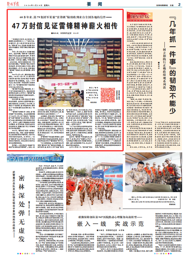 今年3月5日是第63個(gè)學(xué)雷鋒紀(jì)念日。近段時(shí)間,“雷鋒班”又陸續(xù)收到很多來自全國各地的信件,盡管訓(xùn)練任務(wù)重,但戰(zhàn)士們盡量利用業(yè)余時(shí)間,給每一名寫信人回信。“仔細(xì)閱讀一封封來信,我們對(duì)雷鋒精神有了更加深刻的理解?!薄袄卒h班”班長牟振華告訴記者,榜樣的力量是無窮的,雷鋒精神激勵(lì)著一代代人成長,更激勵(lì)著“雷鋒班”的每名戰(zhàn)士珍惜榮譽(yù)、續(xù)寫光榮。