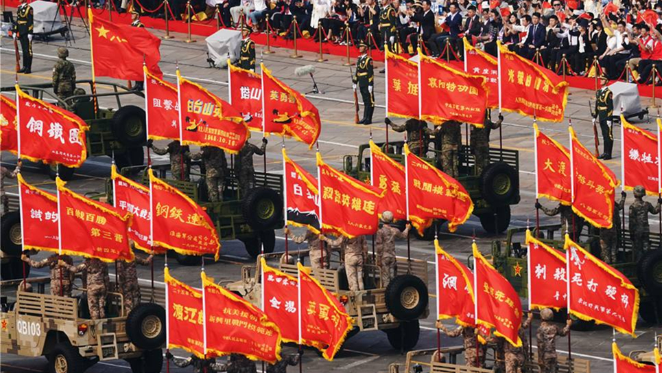 戰(zhàn)旗獵獵,榮光閃耀。在慶祝中華人民共和國成立70周年盛大閱兵式上,由五面中國人民解放軍軍旗和百面榮譽(yù)戰(zhàn)旗組成的戰(zhàn)旗方隊(duì)整齊列陣、氣勢恢宏。這是戰(zhàn)旗方隊(duì)首次出現(xiàn)在國慶閱兵中,接受祖國和人民的檢閱。戰(zhàn)旗迎風(fēng)飄揚(yáng),展示了我軍從勝利走向勝利的輝煌歷程,承載著先輩們用鮮血和生命鑄就的崇高榮譽(yù),激勵(lì)全軍官兵傳承紅色基因,在強(qiáng)軍興軍征程中一往無前、再立新功。