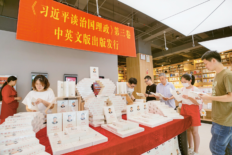 《習(xí)近平談治國理政》第三卷的出版發(fā)行,是全黨政治生活中的一件大事,對于推動廣大干部群眾學(xué)懂弄通做實(shí)習(xí)近平新時代中國特色社會主義思想、幫助國際社會更好了解這一重要思想的主要內(nèi)容,具有重要意義。圖為2020年7月3日,浙江省瑞安市新華書城,市民在《習(xí)近平談治國理政》第三卷中英文版專柜前專心閱讀。 中新社發(fā) 孫凜/攝